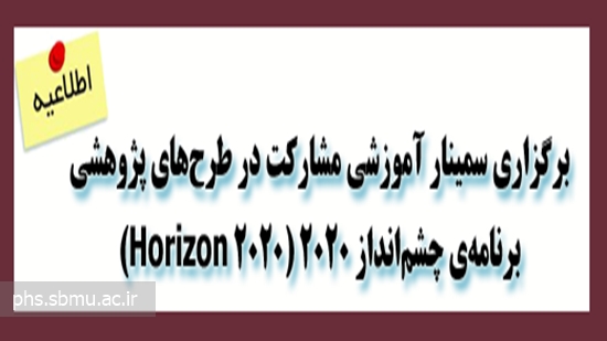 به استحضار می‌رساند مؤسسه ملی توسعه تحقیقات علوم پزشکی ایران (NIMAD) در نظر دارد با همکاری امور بین‌الملل وزارت بهداشت، درمان و آموزش پزشکی و اداره کل تحقیقات و نوآوری کمیسیون اروپا سمینار آموزشی «مشارکت در طرح‌های پژوهشی برنامه‌ی چشم‌انداز ۲۰۲۰ (Horizon 2020را با مشخصات زیر برگزار کند: