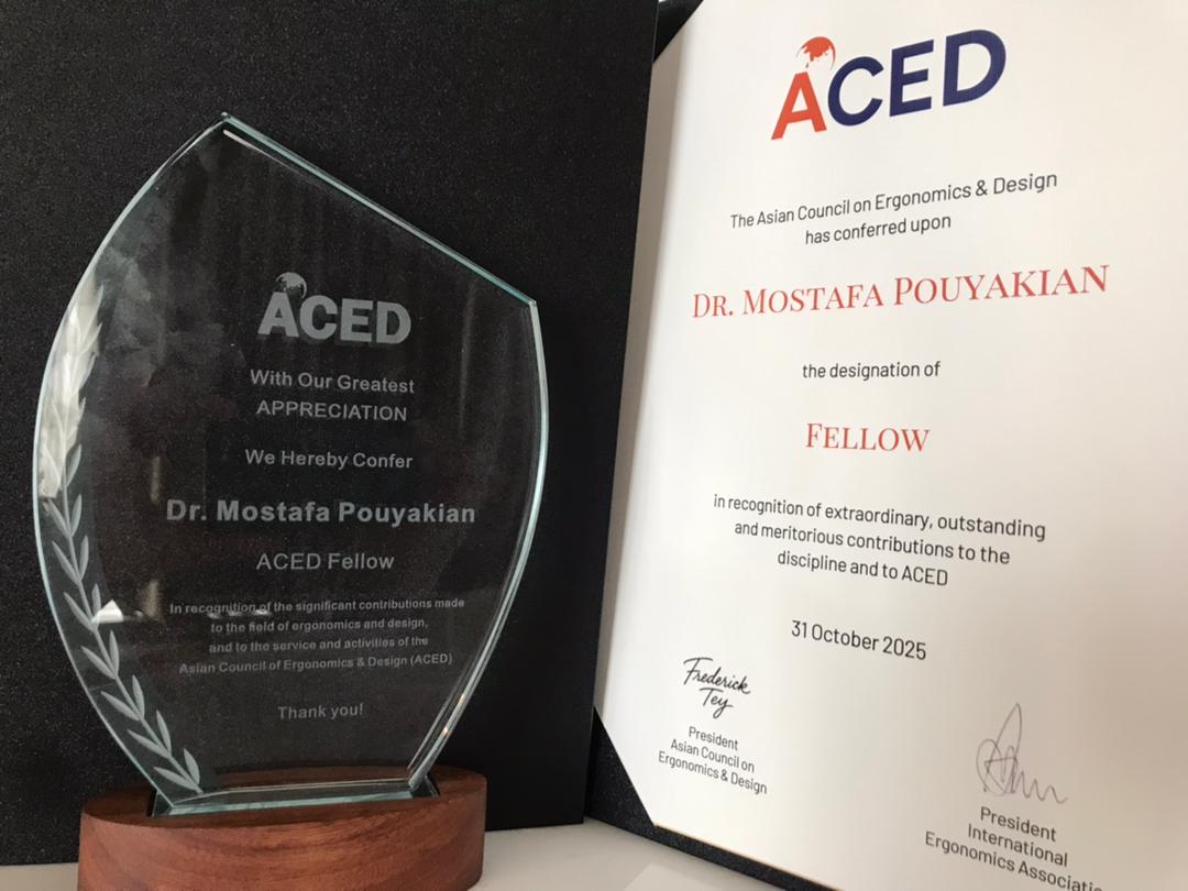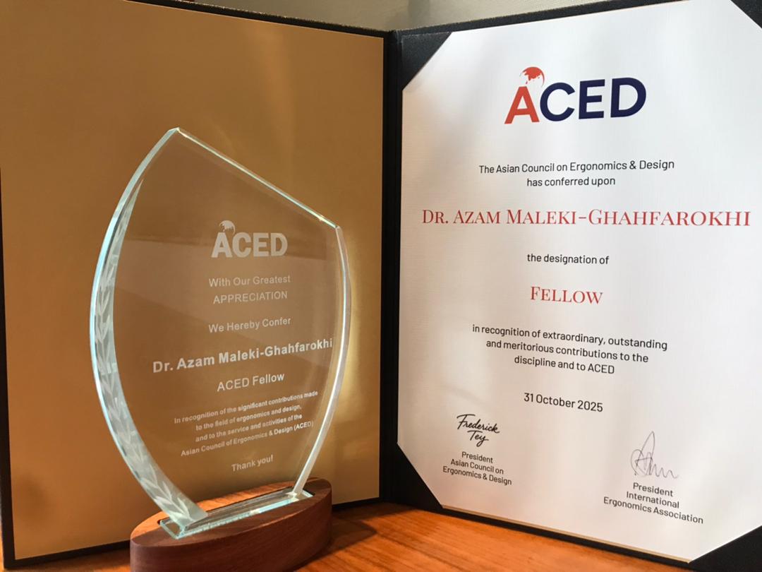 این جایزه ارزشمند که از سوی شورای آسیایی ارگونومی و طراحی برای قدردانی از افراد برگزیده از کشورهای عضو که نقش چشمگیری در راهبری و توسعه پایدار دانش ارگونومی و طراحی داشته اند تقدیم می شود و گواهی بر تلاش‌های علمی بی‌وقفه، تعهد حرفه‌ای مثال‌زدنی و نقش بی‌بدیل شما در پیشبرد و توسعه پایدار دانش ارگونومی در سطح بین‌المللی است.