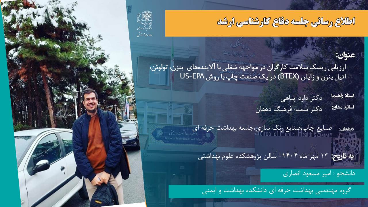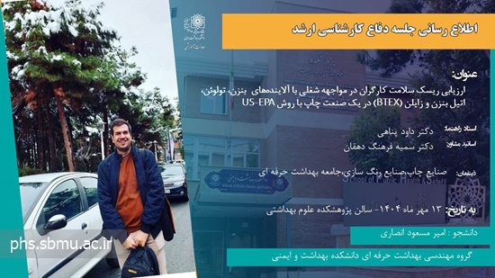 دفاع دانشجو امیرمسعود انصاری- گروه مهندسی بهداشت حرفه ای و ایمنی کار گروه خبری : دفاع ها و ژورنال کلاب ها کد خبر : 161418 لینک کوتاه کلید واژه